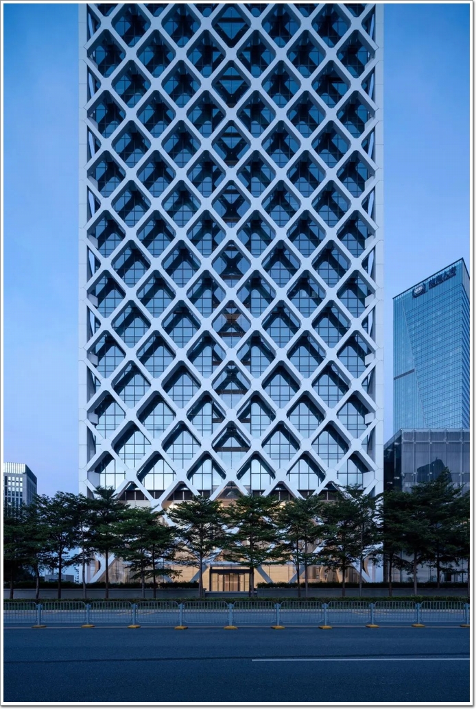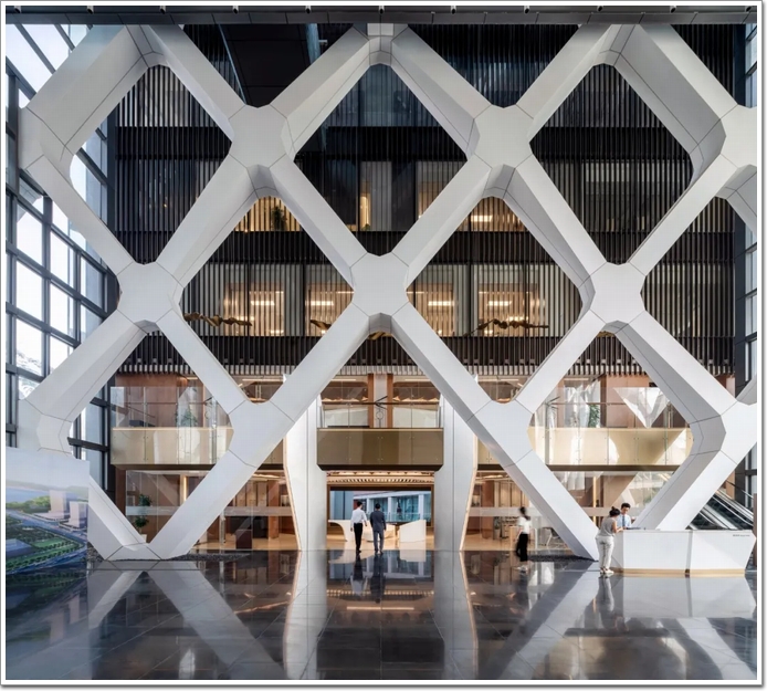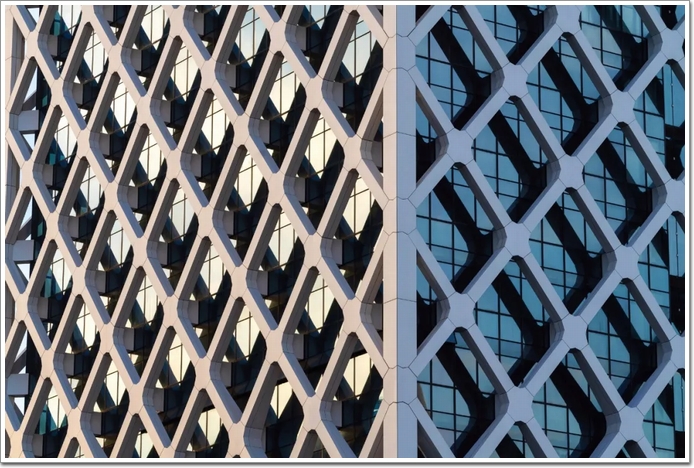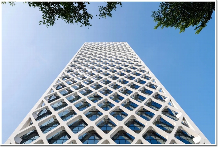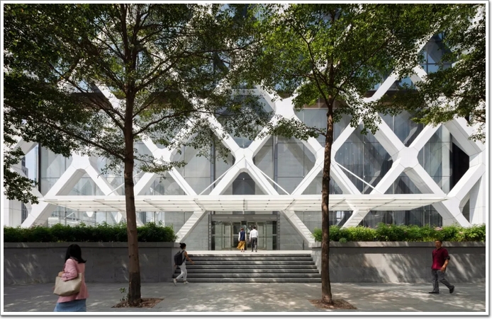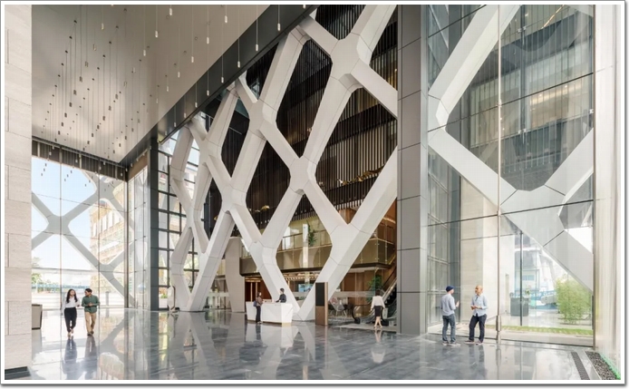 如此設計源于SOM創新結構工程解決方案的積淀,據中國幕墻網ALwindoor.com進一步了解發現:該設計融合了一個緊密間隔的斜交網格,可用于兩個主要目的:首先是為建筑物及其居住者提供遮陽系統,這是減輕該地區炎熱的熱帶陽光的重要考慮因素,太陽能增益因此減少了大約 34%,并顯著減少了內部辦公空間的眩光(詞條“眩光”由行業大百科提供)。