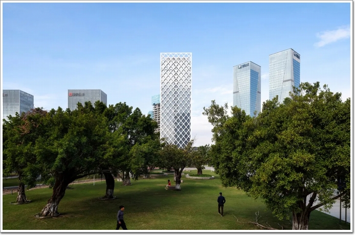 深圳信通金融大廈應運而生是一座162米高、33層的塔樓,位于深圳寶安區寶興路以西,海秀路以北,公園一隅。業主方深圳農村商業銀行股份有限公司,邀請建筑設計單位SOM和北京院,以及幕墻施工企業”江河JANGHO”一道,通過一系列應對該地區的熱帶氣候親生物,以及可持續的設計解決方案,帶來了一座富有“有生命力”的建筑。