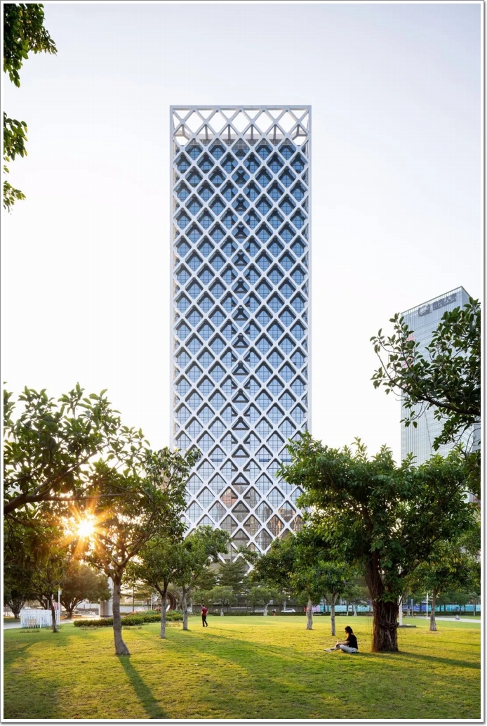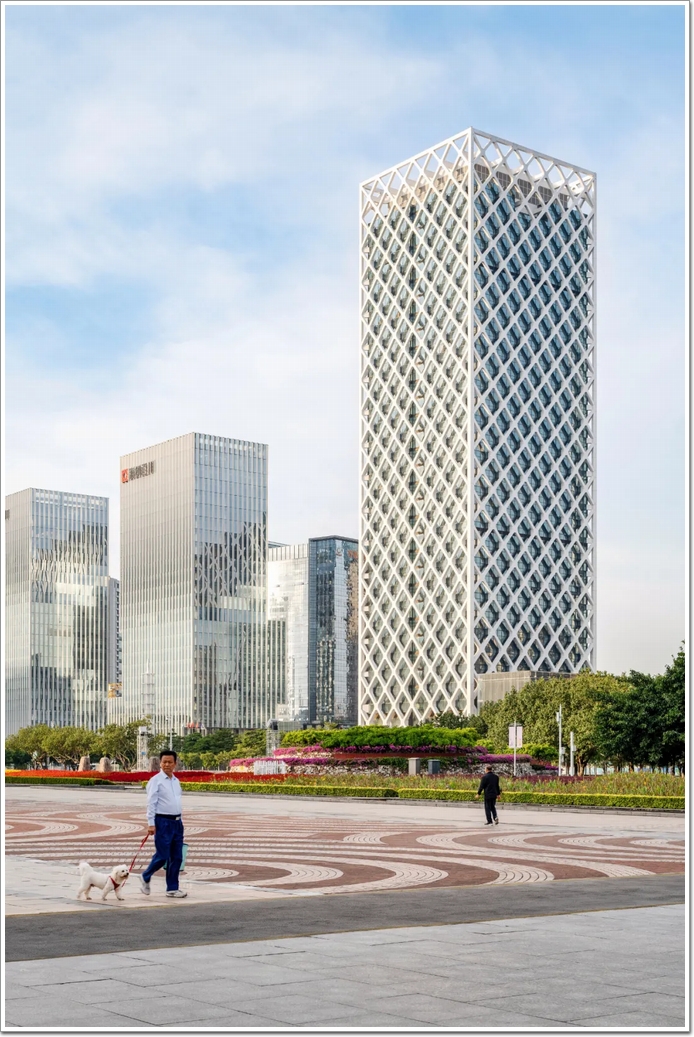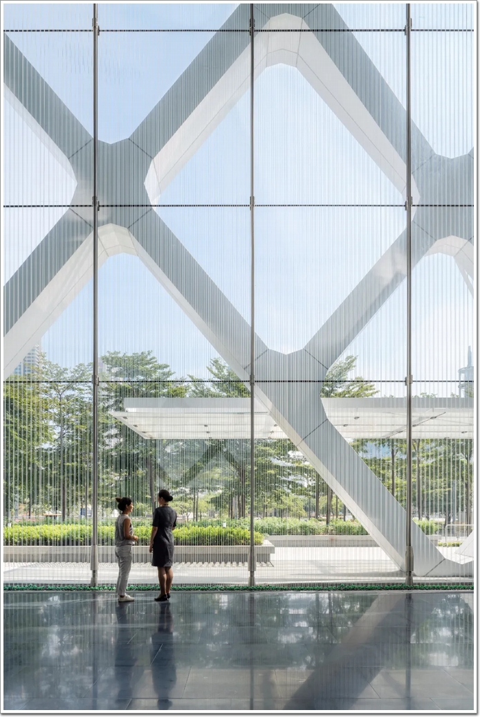 塔樓的立面由一個外部斜肋定義,它既是建筑物的結構,也是一個重要的遮陽元件。在它的底部,斜肋板加寬,形成帶框的開口,可以看到周圍公園和中國南海,距離建筑物僅幾步之遙。