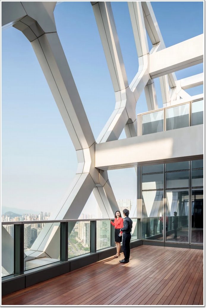 同時,在”黑科技“材料的支持下——垂直中庭中的自動百葉窗橫貫塔的整個高度,每個辦公樓層的機械化窗戶通風口構成了一個靈活的系統,使建筑物能夠在深圳經常經歷的宜人天氣期間“呼吸”。