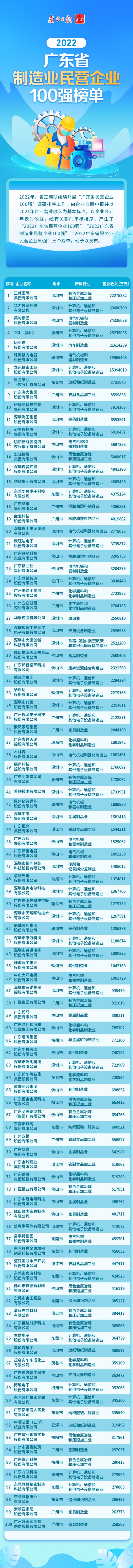 據悉,2022廣東省民營企業100強榜單是在全國工商聯規模民營企業調研的基礎上,經有關部門審核,結合廣東實際排序產生的,已經連續發布7年。而制造業民營企業100強與服務業民營企業50強兩份榜單均是今年首次發布。