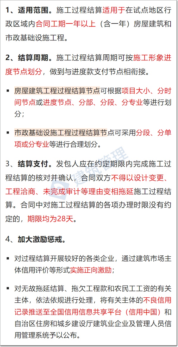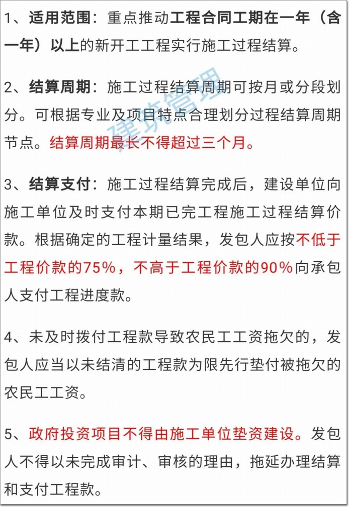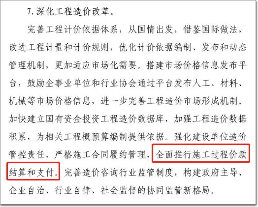 國常會(huì)明確要求在工程建設(shè)領(lǐng)域全面推行過程結(jié)算,住建部多次提出全面推行施工過程價(jià)款結(jié)算和支付。