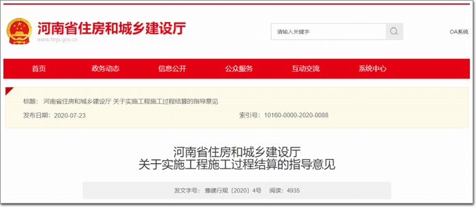 2020年7月23日,河南省住建廳下發(fā)《關(guān)于實(shí)施工程施工過程結(jié)算的指導(dǎo)意見》。