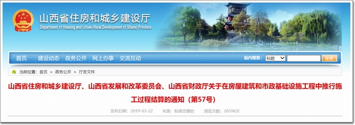 2019年3月22日,《山西省住房和城鄉(xiāng)建設(shè)廳、山西省發(fā)展和改革委員會(huì)、山西省財(cái)政廳關(guān)于在房屋建筑和市政基礎(chǔ)設(shè)施工程中推行施工過程結(jié)算的通知(第57號(hào))》(以下簡稱《通知》)發(fā)布,從5月1日起,在房建和市政工程中推行施工過程結(jié)算。