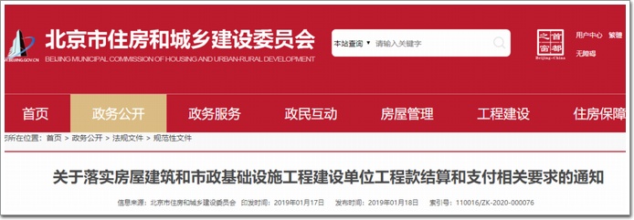 2019年1月17日,北京市住建委發(fā)布《落實(shí)房屋建筑和市政基礎(chǔ)設(shè)施工程建設(shè)單位工程款結(jié)算和支付相關(guān)要求的通知》,其中明確指出: