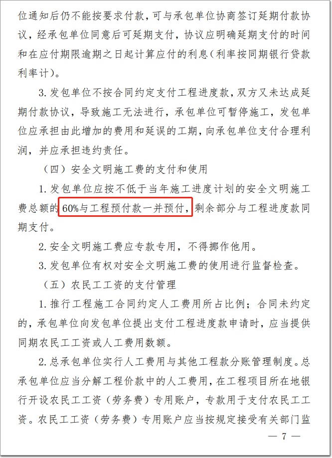 6、發(fā)承包雙方不得因施工過程結(jié)算計(jì)價(jià)爭議,不按合同約定的周期撥付工程款中的人工費(fèi)用。