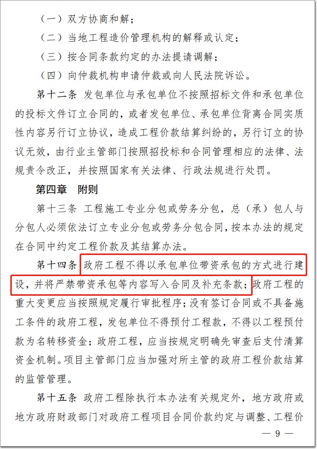 第十一條 建設(shè)單位應(yīng)有滿足施工所需的資金安排,并向施工單位提供工程款支付擔(dān)保。建設(shè)合同應(yīng)約定施工過程結(jié)算周期、工程進(jìn)度款結(jié)算辦法等內(nèi)容。分部工程驗(yàn)收通過時(shí)原則上應(yīng)同步完成工程款結(jié)算,不得以設(shè)計(jì)變更、工程洽商等理由變相拖延結(jié)算。政府投資工程應(yīng)當(dāng)按照國家有關(guān)規(guī)定確保資金按時(shí)支付到位,不得以未完成審計(jì)作為延期工程款結(jié)算的理由。