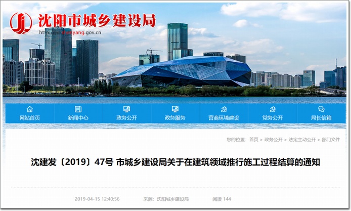 2019年4月,沈陽市城鄉(xiāng)建設(shè)局發(fā)布關(guān)于在建筑領(lǐng)域推行施工過程結(jié)算的通知,自2019年1月1日起執(zhí)行。
