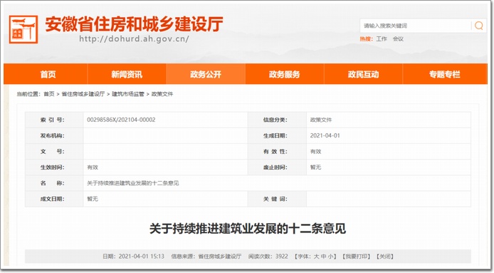 2021年4月1日,安徽住建廳發(fā)布《關(guān)于持續(xù)推進(jìn)建筑業(yè)發(fā)展的十二條意見》,提出: