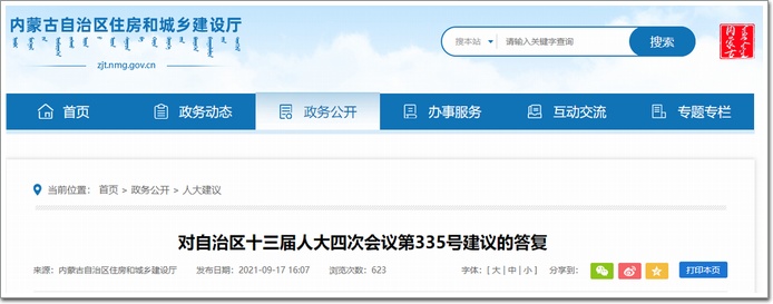 2021年9月17日,內(nèi)蒙古住建廳發(fā)布《對(duì)自治區(qū)十三屆人大四次會(huì)議第335號(hào)建議的答復(fù)》,提出: