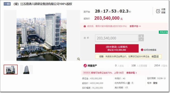 今年9月,此前已申請過三次破產的南通六建,100%股權被成功拍賣。