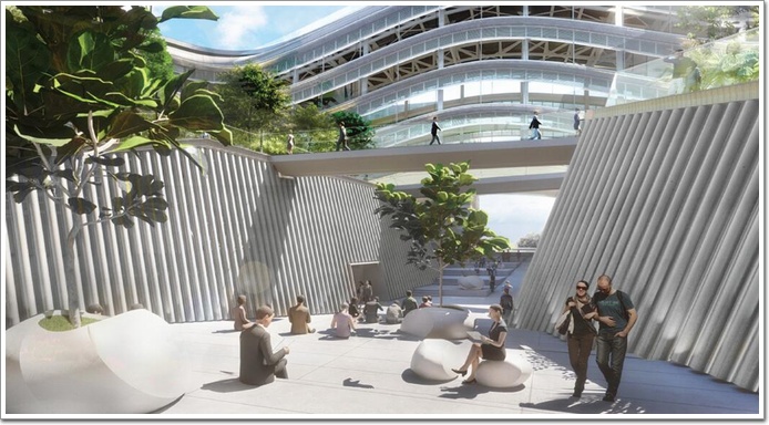 HSC也是一個“三維觀海走廊”,沿它建筑主軸線上的規劃,通過海景觀走廊安排人行軌跡,市民可由首層公共服務大廳聯通用地南北端;通往中央下沉庭院的南北大臺階,也是貫穿建筑的景觀通廊,市民還可經屋面景觀廣場通往濱海區。