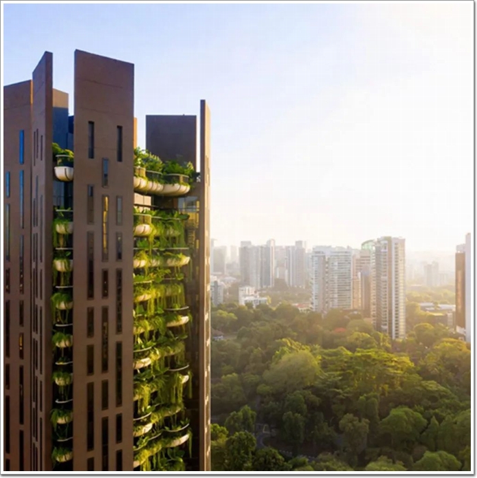 在新加坡,2014年出臺的一項政策要求因發(fā)展而損失的任何綠色植物都必須予以替代。這導致了像希瑟威克工作室(Heatherwick Studio)的伊甸園(Eden)和KPF工作室的羅賓遜塔(Robinson Tower)這樣的塔樓的興起,前者排列著植物填充的陽臺,后者則包括種植的陽臺。
