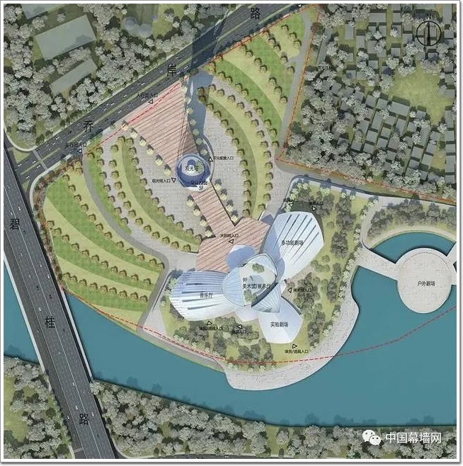 整體規劃如鳳凰棲于桂畔海之濱,中央的大劇院核心功能從頂視圖看,猶如光芒四射的太陽。整體規劃與單體形象相結合,寓意丹鳳朝陽。輔助功能部分線條舒展,與地景融為一體,如鳳舞翻飛,銜花起舞,環繞團抱著核心功能。