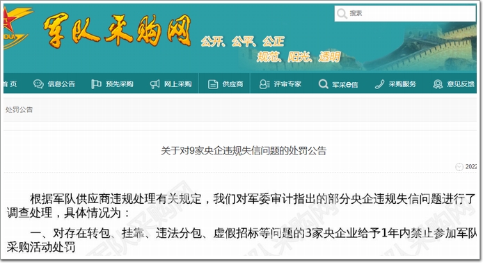 一、對存在轉包、掛靠、違法分包、虛假招標等問題的3家央企業給予1年內禁止參加軍隊采購活動處罰