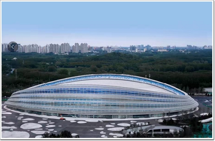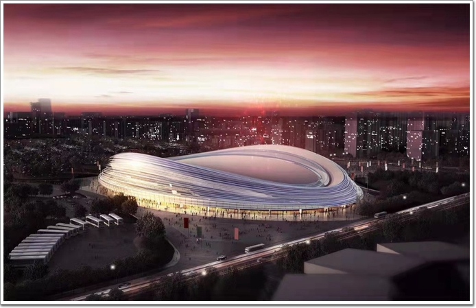 國家速滑館是北京2022年冬奧會標志性場館也是北京賽區唯一的新建場館,位于中國北京奧林匹克公園規劃范圍內,建筑面積約9.7萬平方米,主場館外廊線投影大致呈橢圓形,南北長約240m,東西寬約174m,地下二層,地上三層,建筑高度為33.8m,場館座席約12058席,外立面幕墻由22根曲線環形玻璃幕墻隨外立面環繞而成,平均每條長約622米,復雜曲面幕墻是“冰絲帶”理念的主要載體也是建筑效果的核心特征,故國家速滑館又稱“冰絲帶”,寓意冰和速度的結合,與國家體育場“鳥巢”、國家游泳中心“水立方”相呼應,形成“水”“火”“冰”的和諧對比,共同組成北京這座世界首個“雙奧之城”的標志性建筑群。