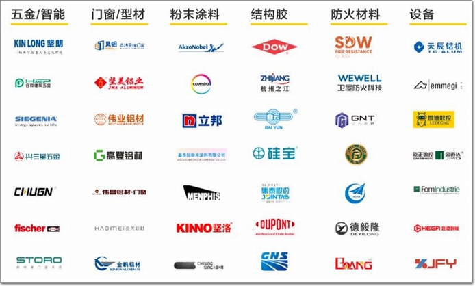 堅美、亞鋁、新河、高登、偉昌、偉業、豪美、廣亞等鋁型材企業;堅朗、合和、春光、興三星、堅威等五金配件企業;天辰、金工等加工設備企業;之江、白云、硅寶、安泰、中原、陶熙等密封膠企業,以及泰諾風、白云易樂、聯和強、榮基等隔熱條和密封膠條企業,金剛等建筑玻璃企業。