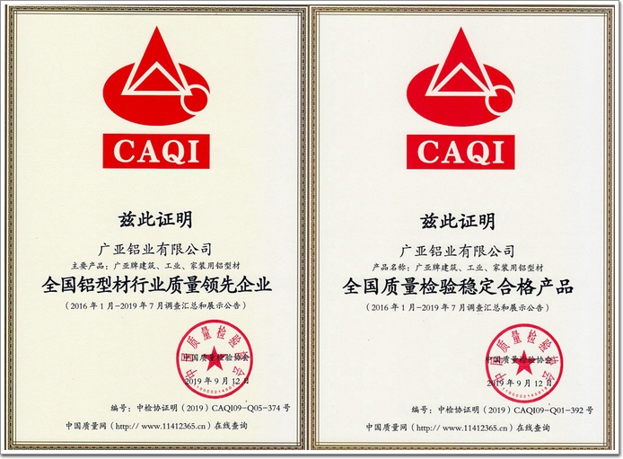 值得一提的是,廣亞鋁業(yè)先后榮獲由中國質(zhì)量檢驗(yàn)協(xié)會授予的中國質(zhì)量領(lǐng)先企業(yè)、中國質(zhì)量穩(wěn)定合格產(chǎn)品等一系列榮譽(yù)。