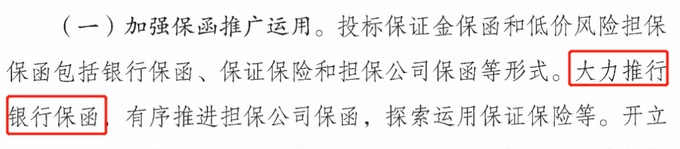 一是全面推行工程保函替代保證金。對于工程建設領域的投標保證金、履約保證金、工程質量保證金、農民工工資保證金,企業可以工程保函的方式繳納,任何單位和部門不得排斥、限制或拒絕。