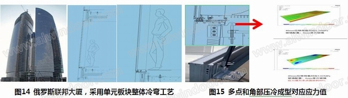 例如,俄羅斯聯邦大廈(如圖14),外立面為雙曲面形態。該項目中把玻璃組裝為單元幕墻板塊,現場通過拉單元掛件實現雙曲面玻璃,使邊框形成微弧線,保持較低的玻璃板塊內永久附加應力。 圖14 俄羅斯聯邦大廈,采用單元板(詞條“單元板”由行業大百科提供)塊整體冷彎工藝 針對冷彎玻璃幕墻,玻璃附加集中應力較小的方式為,“單元化框與玻璃組裝為整體,再進行整體冷彎”工藝。實際案例應用和理論計算表明,當翹起量小于短邊長的1/60時,單元板按平板尺寸進行組裝,現場通過單元連接件拉接安裝即可。翹起量大于玻璃短邊1/60時,應該按扭曲后的理論形狀建單元板塊3D模型,并按構件實際尺寸和形狀進行加工和組裝完成,從而獲得扭曲的單元板塊的框單元。此時,安裝平板玻璃并壓緊時,由于玻璃平面外剛度,存在一定的回彈量。現場通過單元連接件再拉接就可以完成所要的最終玻璃和單元板形狀。這是冷彎玻璃的技術核心。