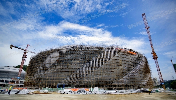 綜合體育館外形由12片花瓣組成,花瓣環繞簇擁螺旋展開。“花瓣”用9420塊3mm厚雙曲面穿孔鋁單板(詞條“鋁單板”由行業大百科提供)和924支直徑200的空間扭曲弧型裝飾鋁合金圓管格柵在現場組裝而成,使整個建筑形體顯得輕盈飄逸,獨具匠心。場館建筑高度為38.9米,相當于10多層的住宅樓高度(見下圖2)。
