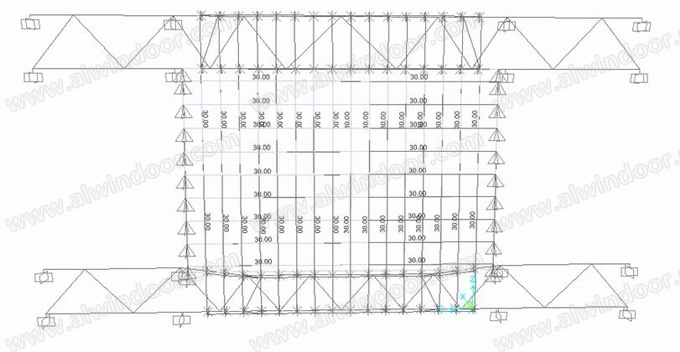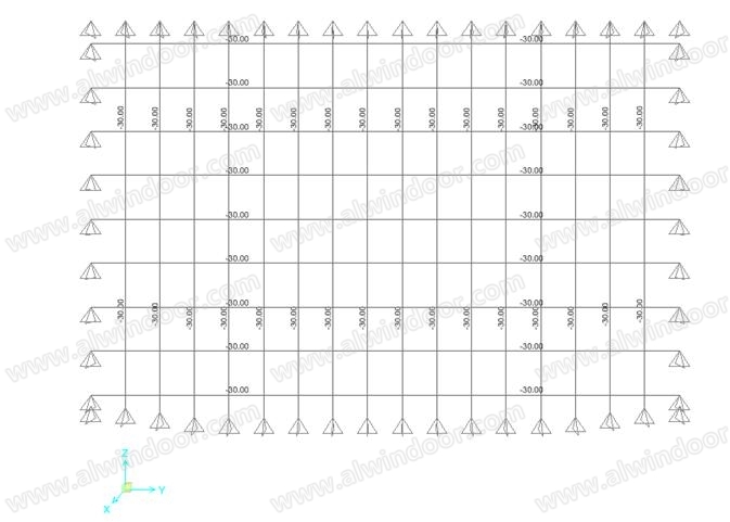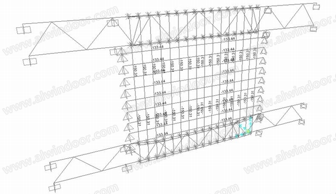 (6)索與主體梁連接為鉸接節點,主體柱不建模,在梁與柱連接處設為剛性節點支座(詞條“支座”由行業大百科提供),有樓板的部位在垂直于幕墻面方向施加位移約束。