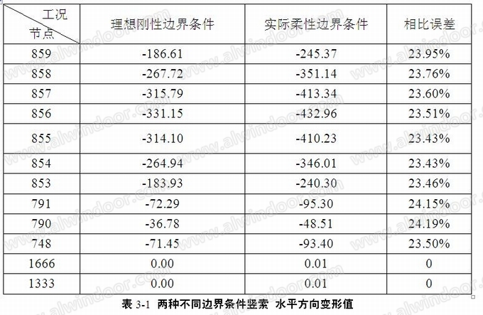 在兩種不同邊界條件相同校核工況SLS 02: 1.0G+1.0×1.0W+1.0×0.6TU作用下,索網結構的豎向拉索節點水平方向變形值如表3-1所示: