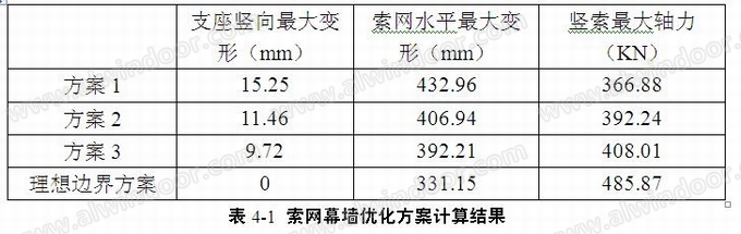 (1)索網幕墻中,不同的邊界條件對索網的力學性能影響較大,用理想支座來模擬實際工程中索網幕墻的支座,分析結果誤差較大,應該考慮實際工程中索網連接的支座條件,必要時將主體結構加入索網結構一起分析計算;