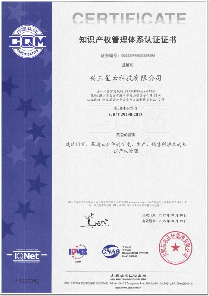 2022年4月20日,興三星以完整規范的知識產權管理流程及高效的工作配合度,順利通過了知識產權管理體系的認證。這表明興三星積極響應國家創新驅動發展戰略,在制造業“雙創”加速升級形勢下,將知識產權視為企業戰略性資源,高度重視專利、技術等知識產權的創造、運用、保護和管理,為公司提質增效注入新動力。