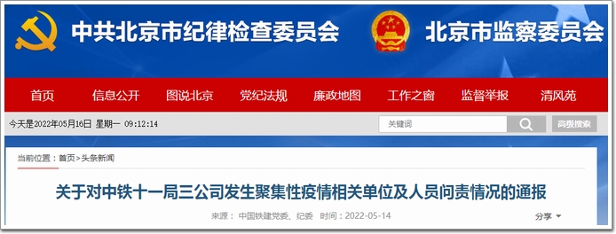 5月14日,中國鐵建黨委、紀委《關于對中鐵十一局三公司發生聚集性疫情相關單位及人員問責情況的通報》,對相關人員進行問責。