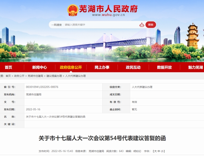 2022年5月16日,安徽省蕪湖市人民政府發布《關于市十七屆人大一次會議第54號代表建議答復的函》,該函是蕪湖市住建局回復蕪湖市一位人大代表在蕪湖市十七屆人大一次會議期間提出的《關于扶持本地建筑施工企業資質等級升級的建議》。