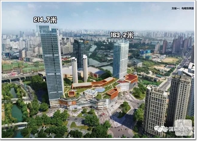 從建筑布局看,項目由一棟214.7米超高層辦公樓、一棟163.2米公寓樓以及6層高的商業綜合體組成,其中超高層位于地塊西側,公寓樓位于地塊東側,商業綜合體處于地塊中部。商業整體的幕墻外立面色彩,以橙色+灰白色+玻璃幕墻為主,整體較為時尚。