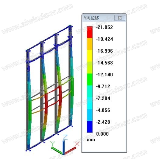 正壓即+2.19kpa作用,最大撓度值+28.29mm;負(fù)壓即-2.19kpa作用,最大撓度值-26.12mm。