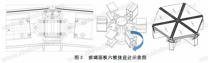 雙曲玻璃表皮采用六片交匯三角形網格劃分,每個三角形玻璃內角各不相同,且相鄰兩片三角形玻璃空間夾角各不相同。玻璃邊線在主體鋼結構的垂直投影線,基本與鋼結構桿件中心線重合。玻璃邊線交點到六棱柱表面的垂直投影點與六棱柱中心重合,同一條玻璃邊線兩端交點到主體六棱柱的垂線不平行。其中,案例一采用中空雙夾膠Low-E玻璃、玻璃邊長2.7m左右;案例二采用夾膠鍍膜玻璃、玻璃邊長2.1m左右。
