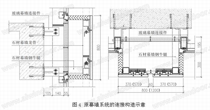 在原設(shè)計(jì)方案中,石材幕墻采用傳統(tǒng)的背栓連接構(gòu)造,由于石材線條的分格尺寸只有800mm,所以在該方案中無完整橫梁,僅通過立柱上懸伸的鋼支臂固定石材面板,成本控制非常到位;玻璃幕墻部分是常規(guī)做法,支撐系統(tǒng)采用經(jīng)典的矩形鋁合金龍骨,玻璃面板采用全隱框的的連接構(gòu)造,玻璃與鋁合金附框通過結(jié)構(gòu)膠粘接,然后采用壓扣件固定到龍骨上;石材線條后面設(shè)置兩扇鋁板平開窗,采用常規(guī)的折頁平開形式。