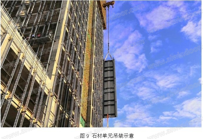 裝配化改造后,標(biāo)準(zhǔn)石材板塊規(guī)格為:800*4500、800*5400,重量約800和900kg,玻璃幕墻板(詞條“墻板”由行業(yè)大百科提供)塊主要規(guī)格是1150*4500,重量不足100kg(不含玻璃)。施工時,先安裝玻璃幕墻單元,然后吊裝石材單元,最后安裝玻璃面板及百葉。單元吊裝也不困難,采用2噸小型吊機(jī)進(jìn)行吊裝即可。
