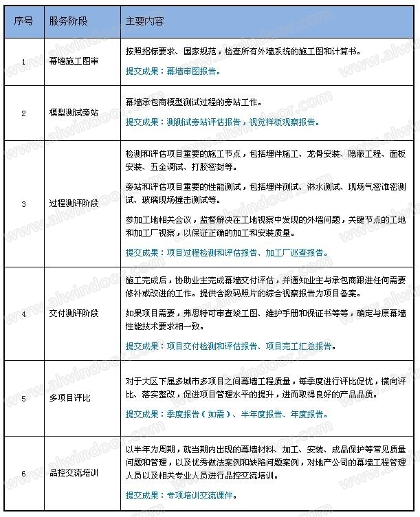 幕墻門(mén)窗質(zhì)量管理和質(zhì)量檢測(cè)以及技術(shù)評(píng)估,借助建筑幕墻品質(zhì)控制、質(zhì)量檢測(cè)以及技術(shù)評(píng)估的成熟方法,協(xié)助開(kāi)發(fā)商和業(yè)主來(lái)規(guī)范項(xiàng)目幕墻工程自設(shè)計(jì)、招標(biāo)、加工、安裝至交付全過(guò)程的管理。