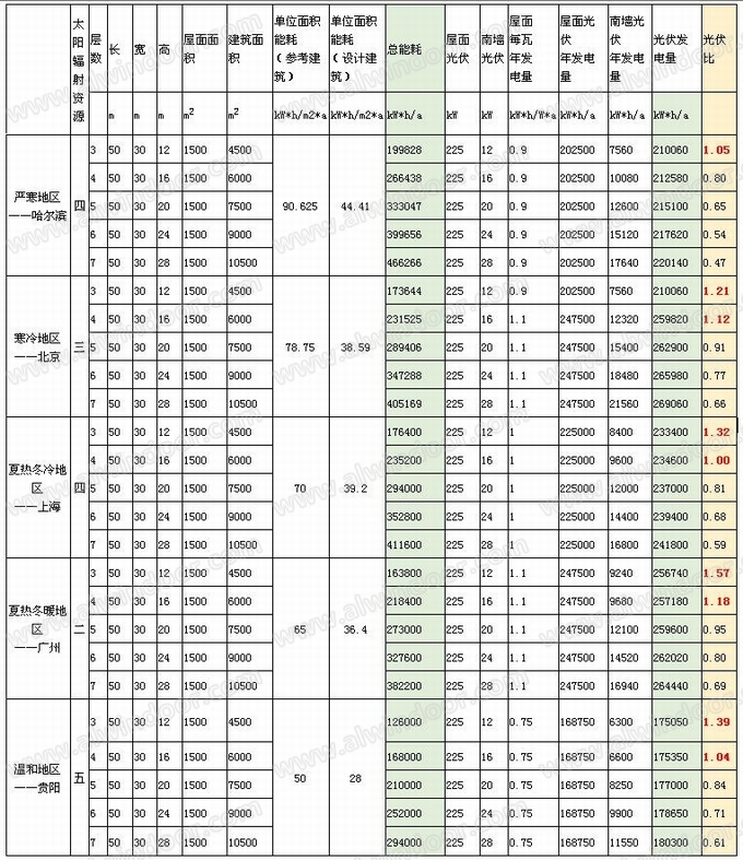 5、光伏預(yù)測:假定屋面可以全部用來設(shè)置BAPV(Building attached photovoltaic systems)系統(tǒng),南立面20%的面積用于設(shè)置BIPV (詞條“BIPV”由行業(yè)大百科提供) (Building integrated photovoltaic systems)系統(tǒng)。預(yù)估屋面一平米150W安裝功率,立面一平米100W安裝功率;高緯度地區(qū)哈爾濱、北京立面是最佳傾角發(fā)電量的70%,低緯度地區(qū)廣州、貴陽是最佳傾角發(fā)電量的55%,而位于中間的上海取60%。以上述邊界條件預(yù)測評(píng)估“零能耗建筑”時(shí)的最大光伏發(fā)電量;