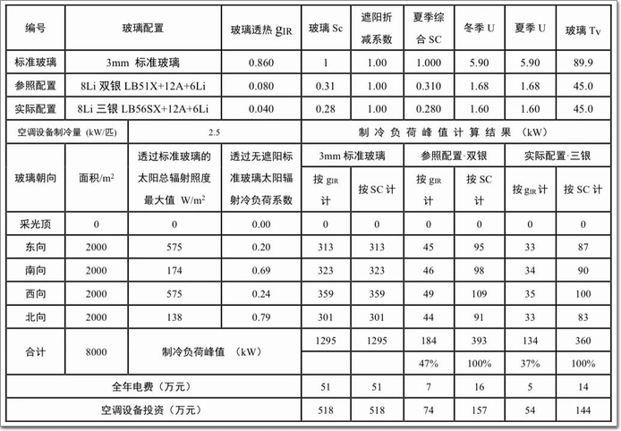 對比不同參數(Sc或gIR)下的電耗總量,若以遮陽系數Sc來核定,雙銀比三銀Low-E的建筑能耗高10%左右,而若以太陽紅外熱能總透射比gIR來核定,雙銀將比三銀Low-E的建筑能耗高近30%,三銀Low-E能夠降低空調電耗確定無疑。