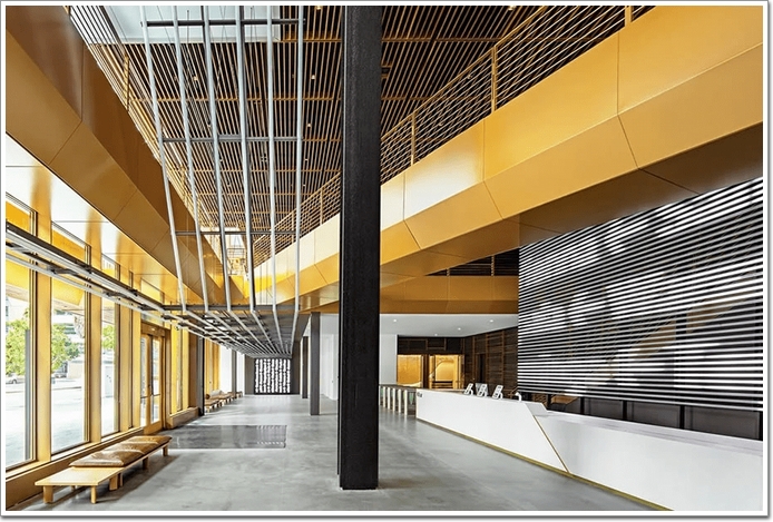 看完了外立面,接下來中國幕墻網ALwindoor.com帶您進入建筑內部。在建筑主入口,選用高檔的黃銅質面板(詞條“面板”由行業大百科提供)拼合木條格柵,陽光下閃閃發亮。