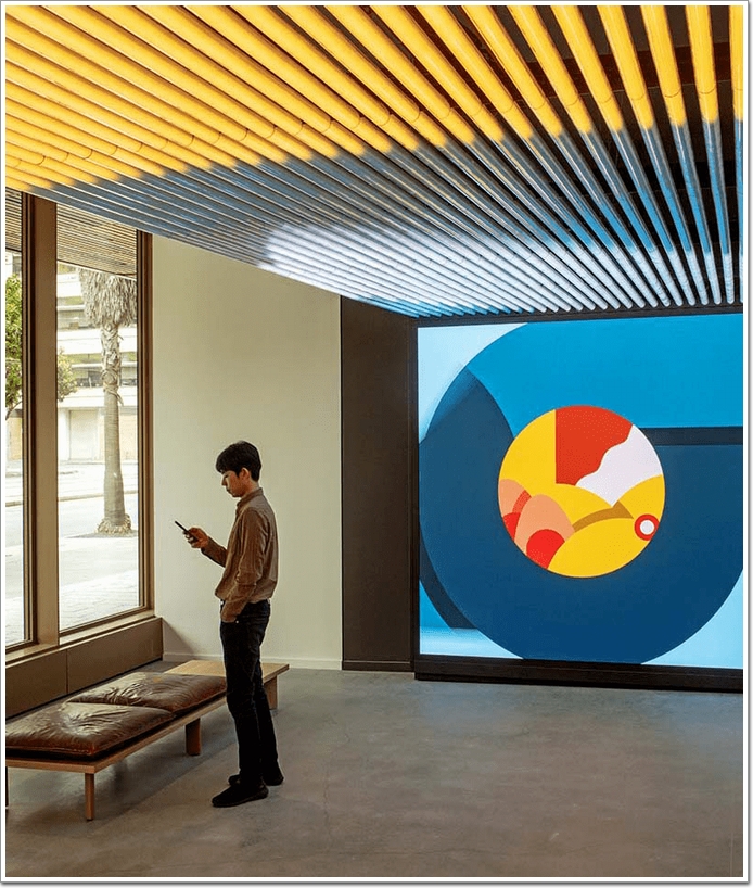 通長連續的燈光管線沿著空間長軸從頂面一直延伸至盡頭的影像墻。