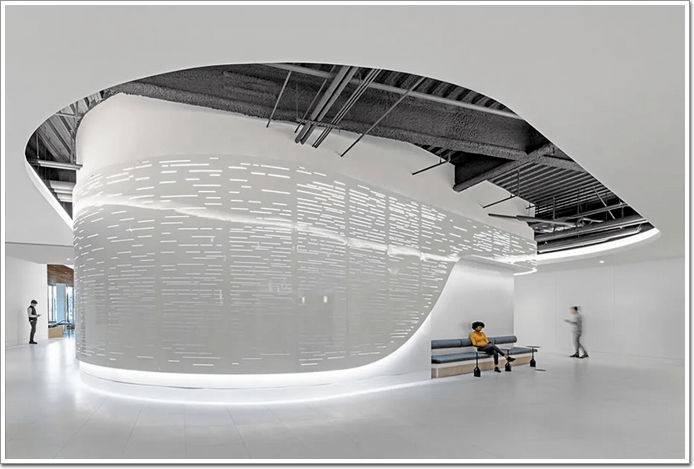 建筑內部,白色透光的沖孔金屬板弧形墻面,引領人們跟隨曲面造型自然進入其他功能區。
