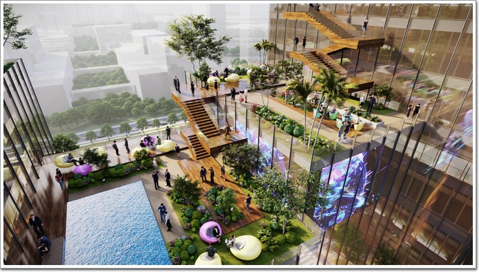每個(gè)區(qū)域都附有小中庭和室外平臺(tái),鼓勵(lì)創(chuàng)新和協(xié)作,從而延伸發(fā)展到整個(gè)辦公總部大樓,形成一個(gè)開放式社區(qū)空間,提供各種設(shè)施、濱水平臺(tái)、活動(dòng)場地以及獨(dú)特的公共空間。