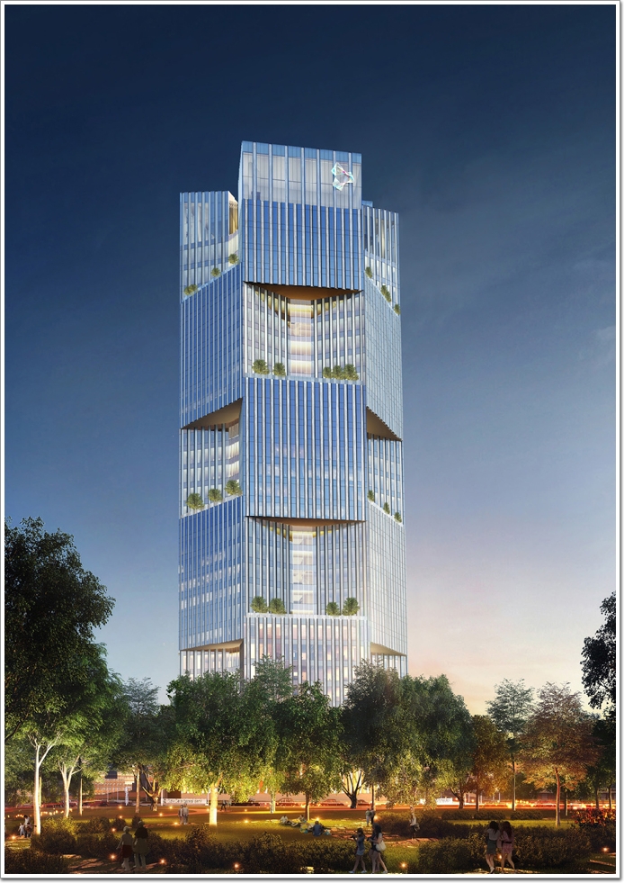 杭州望朝中心塔樓高288米,地下4層,地上57層,總建筑面積169631平方米,項目由浙江誠稻置業(yè)有限公司開發(fā),總投資約25億元,預計2022年3月竣工交付。建成后主要使用功能為寫字樓、酒店和商業(yè)零售空間等。杭州望朝中心采用的8根向外傾斜的巨型柱子形成為了主要結構,讓它的玻璃外觀看起來具有流動性,同時在室內還創(chuàng)建了巨大而又靈活的地板。