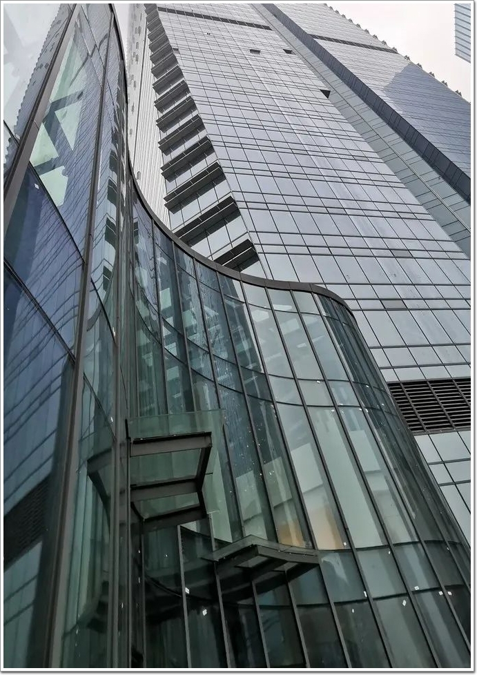 大廈由溫子先設計,深圳三鑫(塔樓)和珠海晶藝(裙樓)共同承建幕墻的珠海橫琴國際金融中心(IFC),目前是珠海和澳門的第一高樓,總高339米,建筑整體外形如同“蛟龍出海”,塔樓的四個部分由裙樓的外側體塊噴薄而出,象征著橫琴匯集了珠海、澳門、香港和深圳的城市精華。由于深圳、珠海等南方沿海城市有較長的臺風季,建筑通常采用流線造型,以降低塔樓風荷載,并精心考量建筑坐向和裙房開口朝向,有效降低風阻,減少陣風,提高行人區(qū)的舒適性,并確保安全無憂。其建筑設計靈感,來自中國古典繪畫經典南宋陳容《九龍圖》中的造型,圖中形態(tài)各異的神龍在滔天駭浪、變幻風云中縱橫穿梭、氣勢逼人。幕墻造型復雜多變,尤其是單元體結構中以空間異形幕墻結構為主,在單體直面與曲面的板塊的連接縫隙處理是工程中最大的難點。