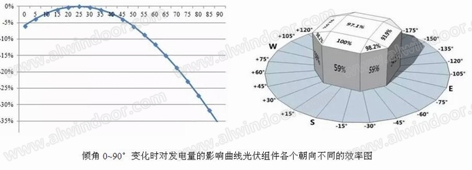 、凇⒐夥M件的安裝角度包含兩個(gè)角度:即傾角和方位角。傾角(高度角),即光伏組件與水平地面之間的夾角;方位角,即光伏組件的朝向與正南方向的夾角。無論是傾角的變化,還是方位角的變化,都會(huì)對(duì)光伏系統(tǒng)發(fā)電量造成直接影響,當(dāng)然,傾角及方位角變化對(duì)發(fā)電量的影響同時(shí)與緯度也相關(guān)。這是一個(gè)綜合因素的分析過程,這里對(duì)簡單的數(shù)據(jù)做一對(duì)比。
