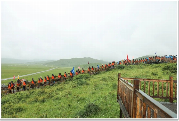 3個小時的穿越,一直陰雨連連,大家不怕苦、不怕累、在內心強大信念的支撐下,我們越走越遠,放眼望去,一條橘色的硅寶隊伍,綿延在這片沼澤地上。最終,我們成功穿越日干喬大沼澤。 隨后,我們來到了一座山腳下,進行了第二階段的挑戰。翻越面前的這座大山,抵達出發點——紅軍過草地紀念碑。