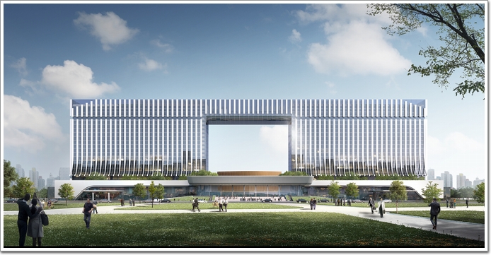 建筑形態(tài)采用立方體結(jié)構(gòu),中部留白,蘊含高鐵新城“窗口”之意,代表著城市無止境騰飛的可能性。同時也考慮避免巨大體量對城市景觀的遮擋,希望人們能從該建筑的開口處一窺新城風貌。