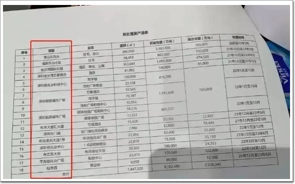 此外,網上流傳的“擬處置資產清單”顯示,佳兆業在深圳的18個項目都將被轉讓,涉及總權益貨值約818億元,面積約144萬方,對應銀行融資約203億元。