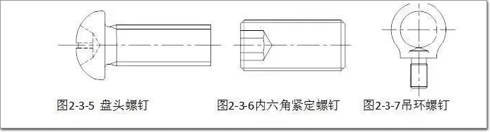 (3)螺釘:也是由頭部和螺桿兩部分構成的一類緊固件,按用途可以分為三類:鋼結構螺釘、緊定螺釘和特殊用途螺釘。機器螺釘主要用于一個緊定螺紋孔的零件,與一個帶有通孔的零件之間的緊固連接,不需要螺母配合(這種連接形式稱為螺釘連接,也屬于可拆卸連接;也可以與螺母配合,用于兩個帶有通孔的零件之間的緊固連接。)緊定螺釘主要用于固定兩個零件之間的相對位置。特殊用途螺釘例如有吊環螺釘等供吊裝零件用。
